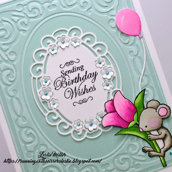Today's card started out with the pretty little not-yet-used die which I cut for the center. It's one of those dies that really needs the card designed around it, rather than the other way around. One thing led to another: Found a sentiment that fit nicely, then embossed and sanded a panel to frame and highlight the die. For color I added a Newton's Nook Garden Mice stamp (from my friend, Cat). Since it was a birthday card I added a die cut balloon, too.